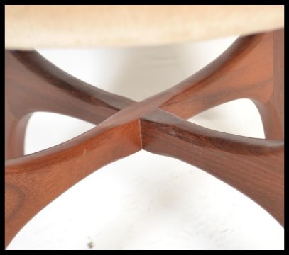 A retro 20th century teak wood circular G-Plan dressing table stool raised on teak wood x-cross base with velour upholstered seat above. 44cms x 51cms diam.