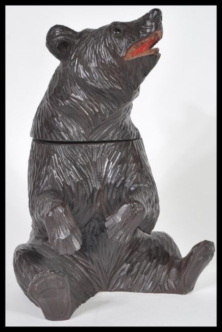 A German Black Forest hand carved wooden tobacco pot or tea caddy in the form of a bear having hinged lid to head. 21.2cm high 16cm wide.