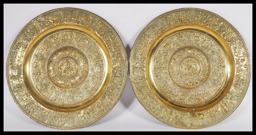 A pair of reproduction 19th Century gilt bronze heavy wall chargers of circular form having relief classical decoration depicting lion masks and figures. 38cm diameter.