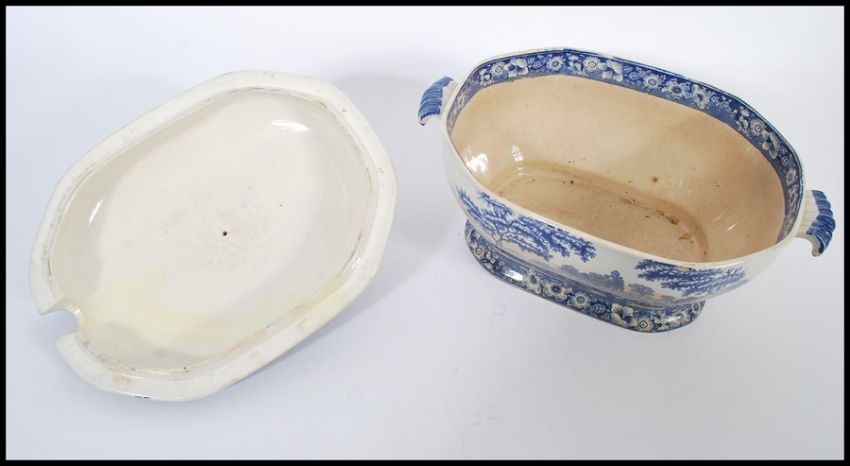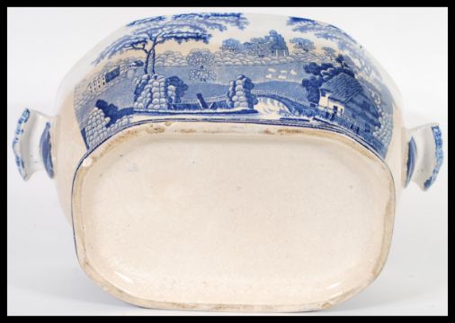 An early 19th century Georgian spode blue and white large tureen and lid having typical decoration with scrolled handles and finial lid.