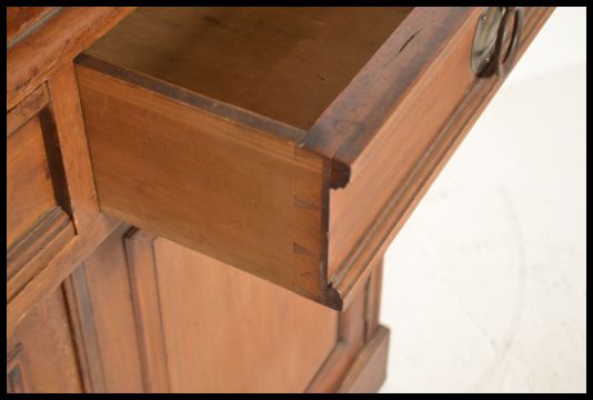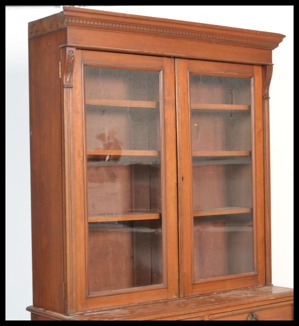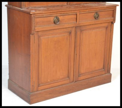 A 19th Century Victorian mahogany library bookcase, cabinet. The top half with moulded cornice above a pair of glazed doors, the base fitted with two drawers above a pair of panelled cupboard doors enclosing shelves raised on a plinth base. Measures: 206cm high x 111cm wide x 50cm deep.