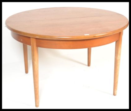 A retro 20th Century teak wood circular extendable dining table, fold out leaf raised on shaped tapering supports. Measures: 74cm high x 122cm diameter.