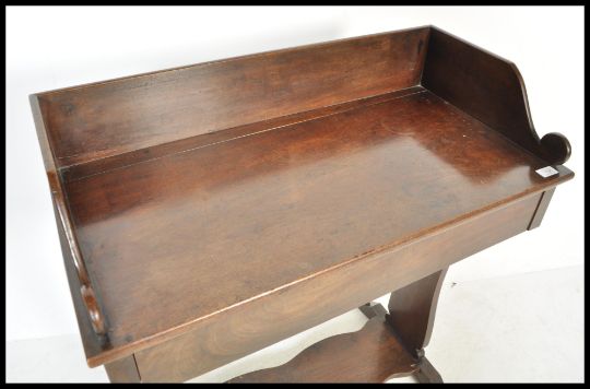 A 19th Regency mahogany writing table desk being raised on lyre shaped supports with a fitted frieze drawer above and a shaped with a rectangular top having gallery surround. Measures: 90cm high x 82cm wide x 42cm deep.