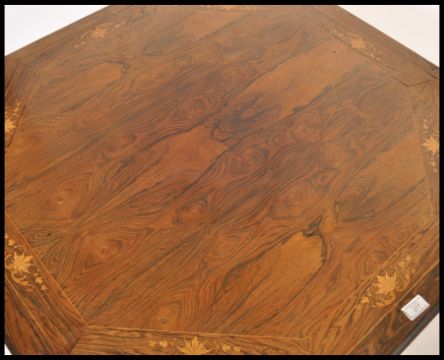 An Edwardian rosewood and marquetry inlaid octagonal centre table in the manner of Edwards & Roberts. Raised on turned supports united by lower tier with gallery surround. Above a fitted frieze with shaped top having marquetry inlaid details. Measures 72cms high x 91cms diam