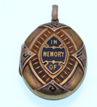 A Victorian gold and enamel mourning memorial hair locket.  - The locket  having enamelled decoration and having the following inscription within  - It is the hope, the blissful hope, which Jesus's grace has given. When a few fleeting years have pass'd. To meet him "there" in heaven. Weight approx 4g. Measures approx 1 1/2 inches.