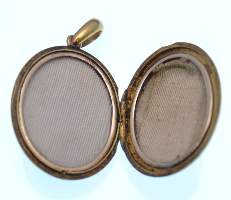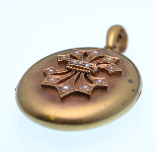 A Victorian gold, half-pearl and diamond oval locket. The locket front with a three stone diamond band having radiating stylised pearl set leaves. Measures 1 3/4 inches.