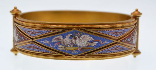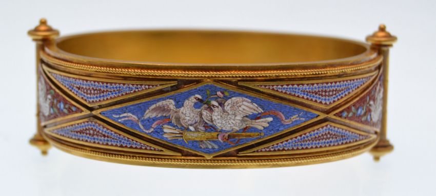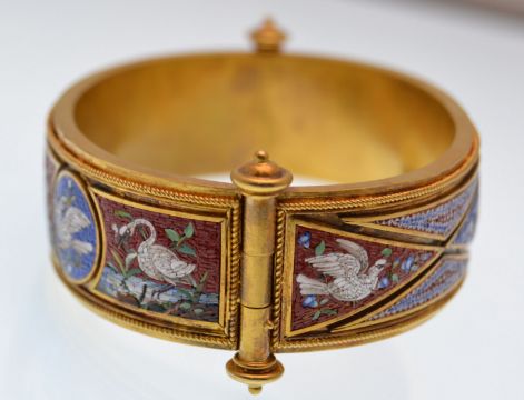 A 19th century Etruscan revival 1860s gold and micro mosaic bangle bracelet. The bracelet being decorated to the obverse with doves and swans and decorated and  to the reverse with scenes of doves, the hinge and clasp designed as pillars with roundel terminations with clip fasteners. French assay marks. Weight approx 39.9g. Measures approx 7 1/4 inches.