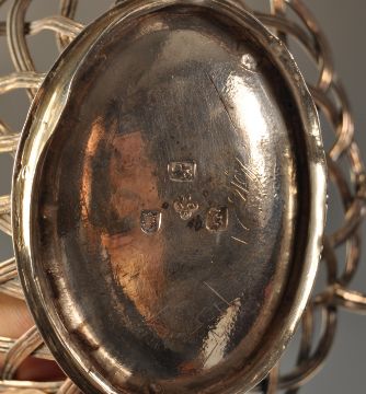 A pair of Mid 18th Century George II hallmarked silver small lattice work baskets / bon bon dishes. Each with simple loop handle and traces of engraved armorials depicting hand holding sword to the centre. Hallmarked for John Henry Vere & William Lutwyche London 1765. Weighs 135 grams. Measures 12cm from handle to handle.