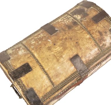 An early 19th Century American leather cowhide and wrought iron banded dome top stagecoach trunk having nailhead studded decoration and iron drop handles. Hinged lid opening to reveal a spacious interior with 19th Century newspapers lining the inside. Measures 61cm wide.