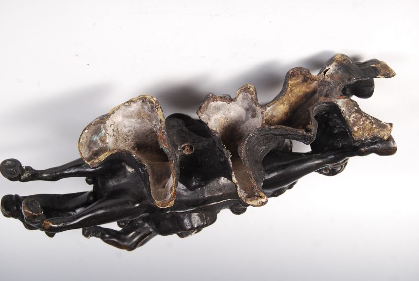 A large Chinese 19th / 20th Century bronze figurine of Guan Yu / Guan Gong riding his horse into battle. Raised on naturalistic base the horse in mid gallop with warrior God atop. Measures 47cm high.