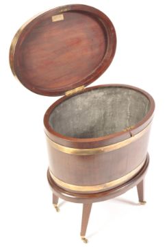 A George III 19th century mahogany & brass bound wine cooler having stunning strap work brass banding with hinged top above complete with key and lock opening to reveal a lead lined interior. Finished on square tapering legs with brass castors. Measures 64cms high x 52cms wide x 38cms depth