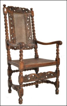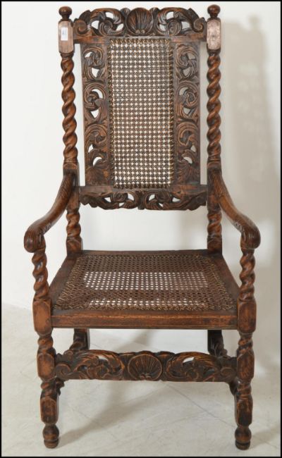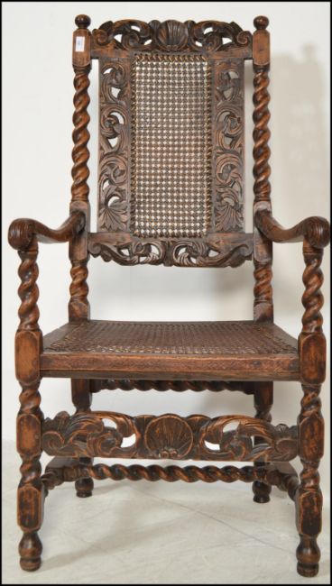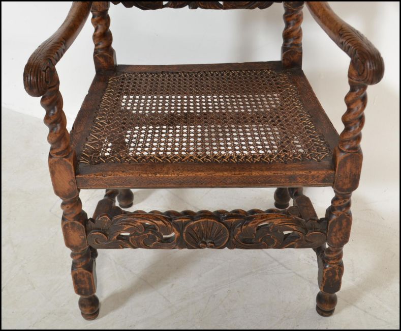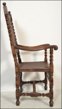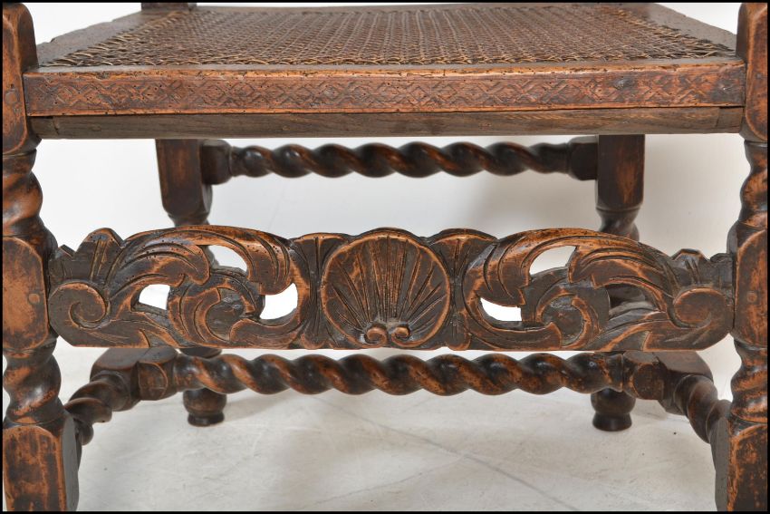 A 17th Century oak carved armchair / chair. The chair with carved top rail over barleytwist turned vertical columns flanking a cane centre with cane panel seat beneath.. All raised on turned and block stretchered legs united by peripheral stretchers having large carved and pierced stretcher to front. Measures 123cms x 60cms x 54cms