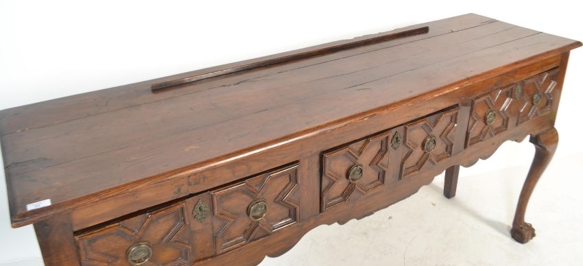 A George III country oak dresser base in the Queen Anne style being fitted with a series of 3 short drawers having geometric moulded fronted with shaped apron beneath and raised on four cabriole legs and terminating in claw and ball feet. Measures 89cms high x 187cms wide x 50cms depth