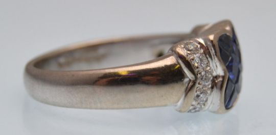 An 18ct gold sapphire and diamond ring. The ring having fancy cut blue sapphires set in a kiss motif with round brilliant cut diamond accented shoulders. Estimated sapphire weight 1.30ct. Estimated diamond weight.20ct. Total weight 7.1g. Size N.5.