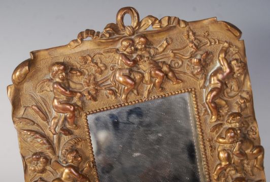 A 19th Century Victorian bronze gilt ormolu easel mirror / picture frame having a central mirror glass panel with fantastic relief decoration depicting cherubs with floral and ribbon decoration. Measures 30cm high.