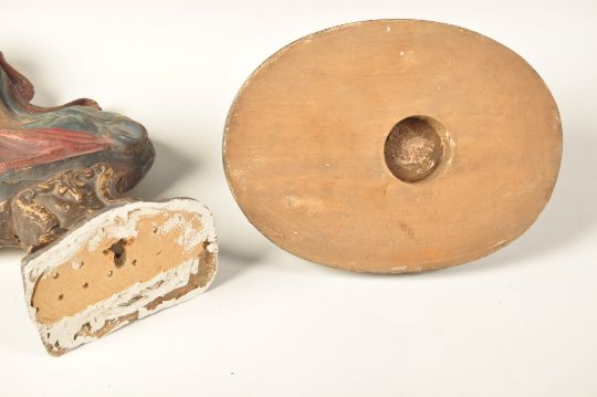 A 19th century papier mache study of Mary stood in flowing robes and head dress raised on a faux marble wooden plinth of oval form. Measures 39cms high x 25cms depth
