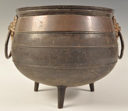 A 19th century Regency copper and cast iron cauldron - coal bucket. The cast iron cauldron being copper bound with lion masks and copper ring handles. Measures 28cms high x32cms diameter