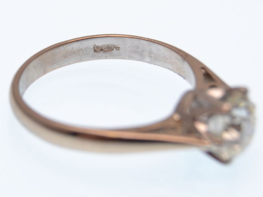 A hallmarked 18ct white gold and diamond solitaire ring. The ring having a round cut diamond in a six prong setting having raised pierced shoulders. Hallmarked Sheffield. Estimated Diamond weight 1.26cts. Total weight approx 3.4g.