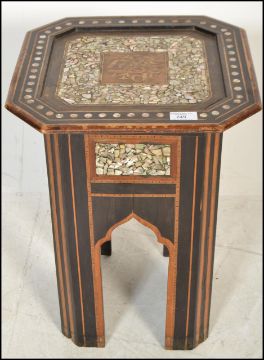 A 19th century Moorish mother of pearl inlaid hardwood square octagonal occasional table raised on a shaped detailed base with pierced arched supports having a squared off octagonal top above with marquetry inlaid centre being heavily inset with mother of pearl pave work. Measures 50cms x 37cms x 37cms