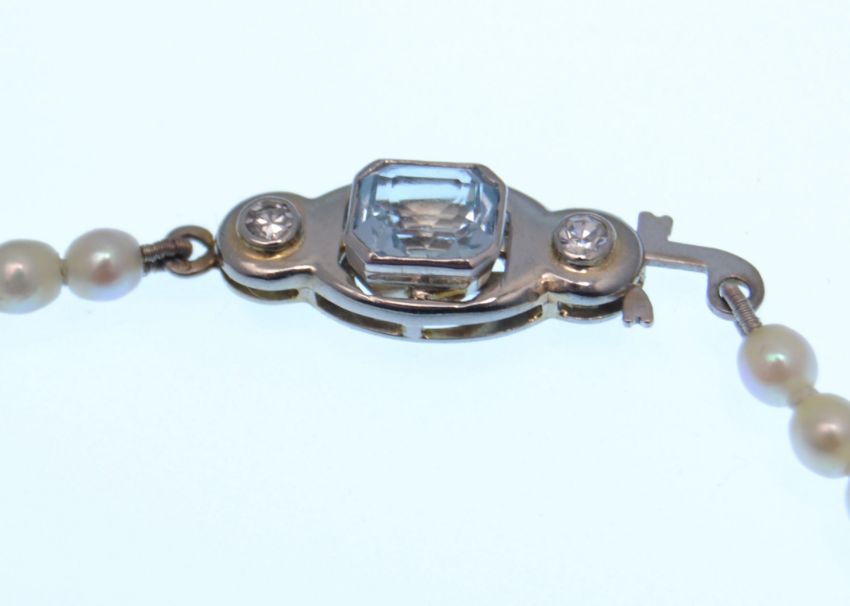 A early 20th century French string of freshwater pearls having an aquamarine and diamond set white gold clasp. The clasp being set with an emerald cut aquamarine flanked by two old cut diamonds. French marks to bale of clasp and to hook - see images. Aquamarine measures approx  4.9 x 5.9 x 3.5 mm, Diamonds  2mm x 1.5mm. Total weight 12.9g.