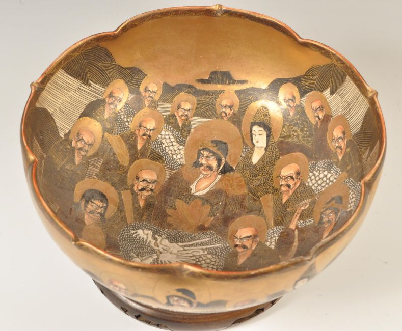 A Japanese Meiji period Satsuma ware bowl having decoration of Elders / Immortals and Geisha's. Deep gilded grounds and decoration the central scene having white bone dragon. Brown stamp to base with gilt marks. Raised on a wooden socle plinth. Bowl measures 10cm high by 25cm wide.
