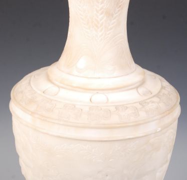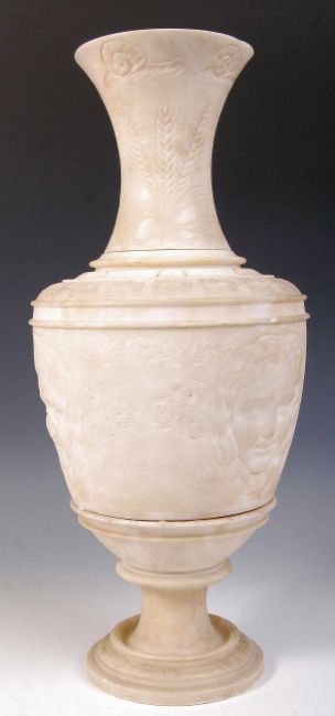 A large 19th century Victorian Alabaster vase of baluster form with trumpet neck having stunning foliate carving and cameo masks of the period. Measures 53cms high