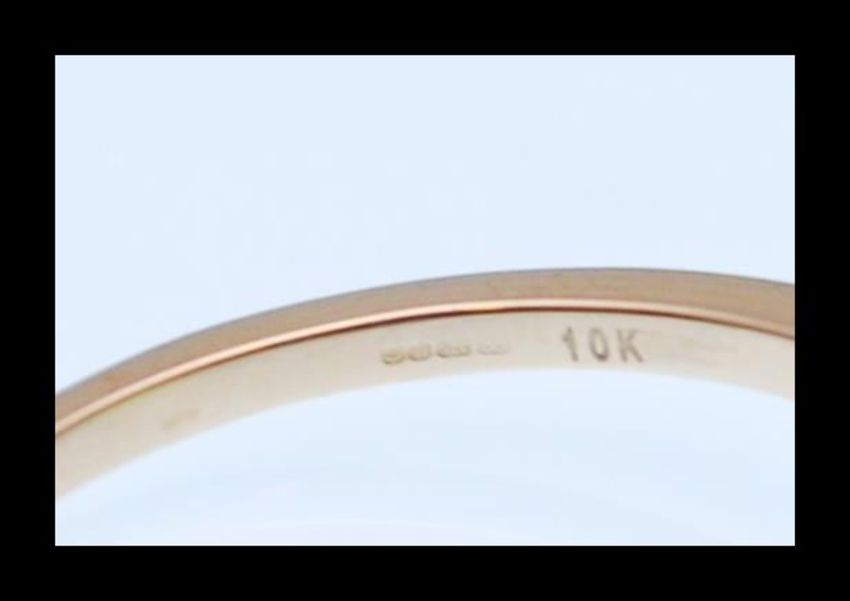 A hallmarked 9ct gold ring prong set with a brilliant cut yellow opalescent stone having a split shank with white accent stones. Hallmarked Birmingham 2015. Weight 2.2g. Size P.5.