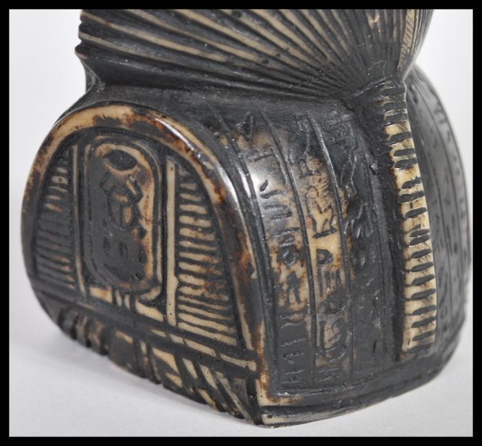 An early 20th Century Grand Tour stone ushabti, the standing figure with chased hieroglyphics together  with a much later resin Egyptian figure and a plaster bust of an Egyptian female bust raised on a square plinth finished in gilt paint  base with markings to the underside reading A.C.M Jan 75. 20cm high tallest.