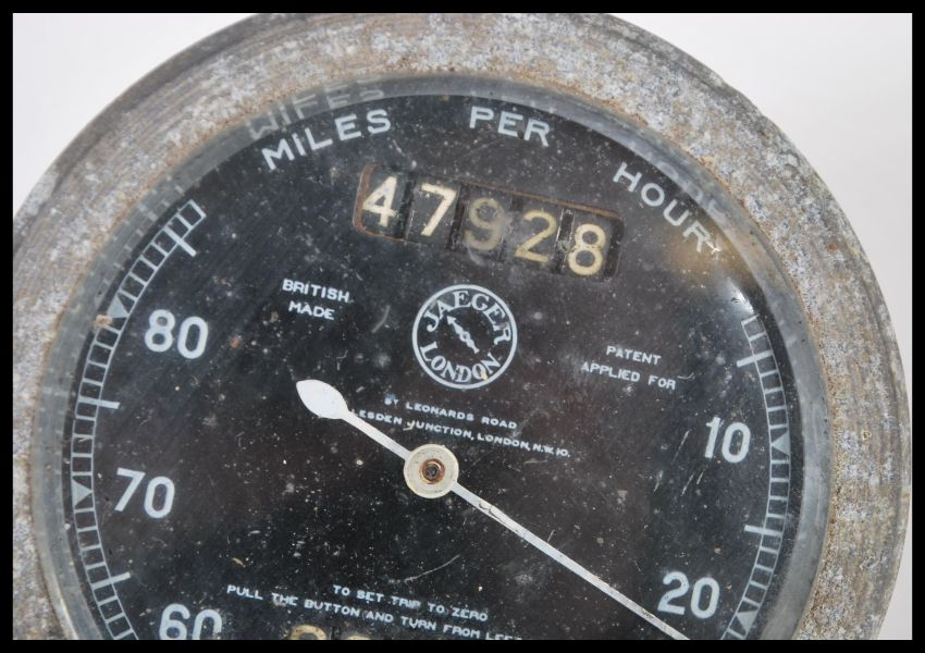 A Jaeger 80mph flanged speedometer having a black face with white hands. 9.5cm diameter.