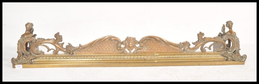A 19th Century Victorian brass and bronze fire fender having brilliant figural finial ends in the form of classical maidens with scrolled sides and stepped gadrooned front. Measures: 25cm high x 136cm wide x 39cm deep.