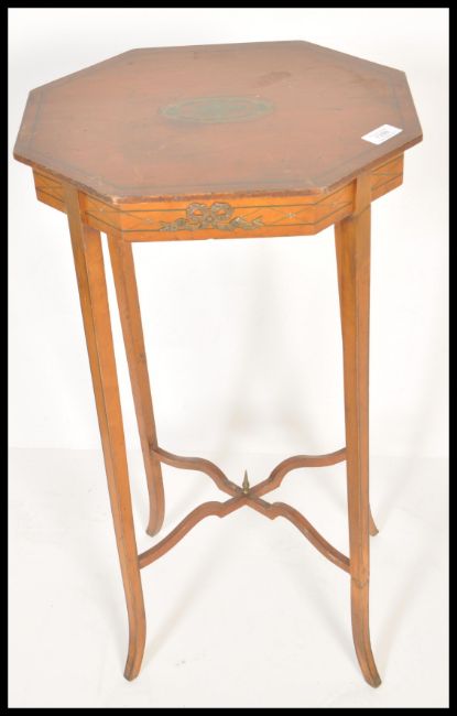 A 19th Century Victorian satinwood urn stand or wine table raised on an X finial base with shaped octagonal top, Decorated with applied gilt brass ormolu plaques and hand painted green details and central cartouche medallion. Measures: 71cm high x 40cm wide x 34cm deep.