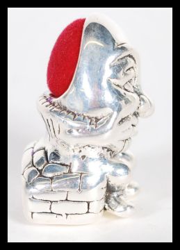 A sterling silver figurine pincushion in the form of humpty dumpty. Weighs 13 grams.