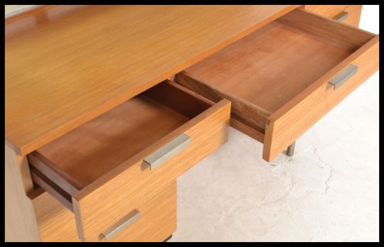 A vintage retro 20th century Stag twin pedestal kneehole dressing table having a twin bank of 3 drawers on each side and a central draw finish in gold oak colour with aluminium handles and raised on tubular chrome supports. Measures: 118cm high x 127cm wide x 46cm deep.