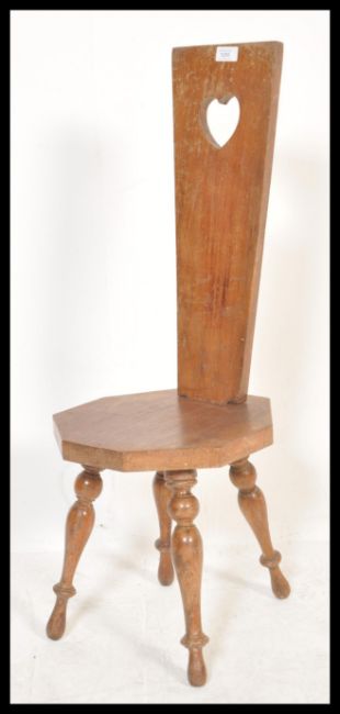 A early 20th century spinning chair raised on turned legs having a pierced heart handle to the back rest and an octagonal seat.