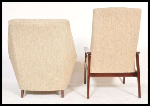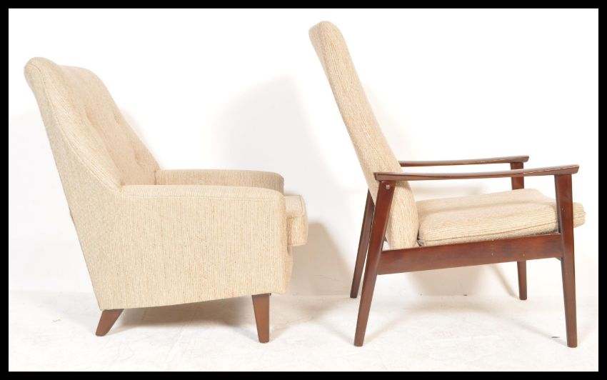 A 20th century Parker Knoll armchair being raised on tapering legs with a-frame style having the wool upholstery together with another Parker Knoll amchair in woollen fabric. Measures: 112cm high x 76cm wide x 30cm deep.