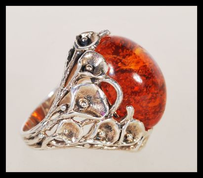 A large sterling silver dress ring in the Art Nouveau style having floral monts with large faux amber cabochon to centre. Weighs 17 grams size P.
