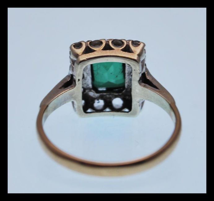 A hallmarked 9ct gold ring set with a square green stone and white accent stones. Hallmarked london. Size K. Weight 2.6g.