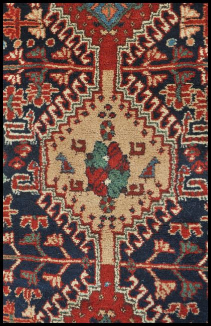 A 20th Century wool Persian floor carpet rug having red and blue ground with central medallion and geometric borders. Measures: 175cm high x 107cm wide.