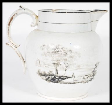 An 18th Century pearlware creamer jug having transfer printed old country house scenes to the front and back, having a shaped handle and brown rims. Measures 19cm-high 21cm-wide.