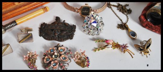A collection of vintage costume jewellery to include brooches, a silver mourning brooch, bug brooch, silver cufflinks, opera glasses, yellow metal necklace, a ladies 14k rolled gold Bulova cocktail watch, another Bulova cocktail watch and one more.