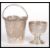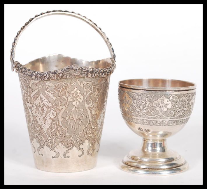 Two pieces of early 20th Century Middle Eastern silver to include an egg cup raised on stepped conical foot with engraved decoration and a miniature bucket with similar design. Total weight approx 121 grams. 6cm high tallest.