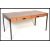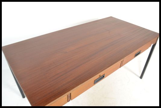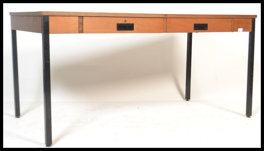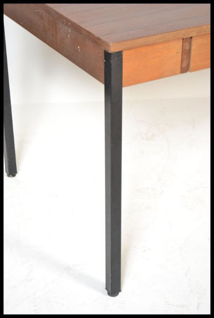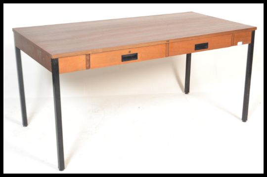 A retro 20th Century teak wood office desk, produced by ` Abbess `, two frieze drawers with fitted wooden handles raised on ebonised tubular supports. Measures 73 cm high, 153 cm wide and 76 cm deep.