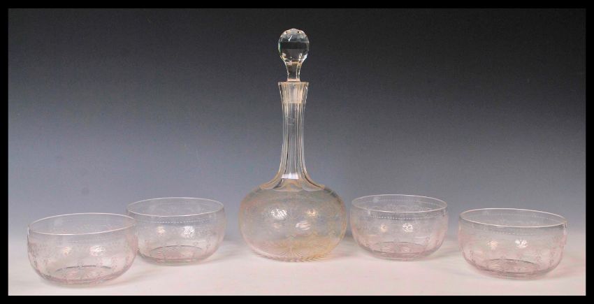 An early 20th Century Edwardian glass decanter and bowl set consisting of tall faceted glass decanter with four matching bowls all having engraves swag decoration. Decanter measures 29cm high.