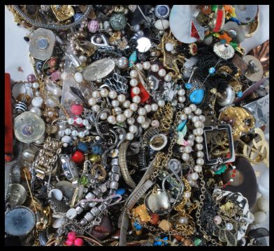 A large collection of vintage mixed costume jewellery to include a wide variety of necklaces, a selection of gold plated earrings many set with white stones, bangles, cocktail watches, simulation pearls, a rhinestone collar necklace and much more.