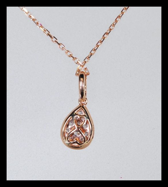 An 18ct rose gold and diamond cluster pendant and necklace set having approx 20pts of diamonds. Weighs 2 grams.