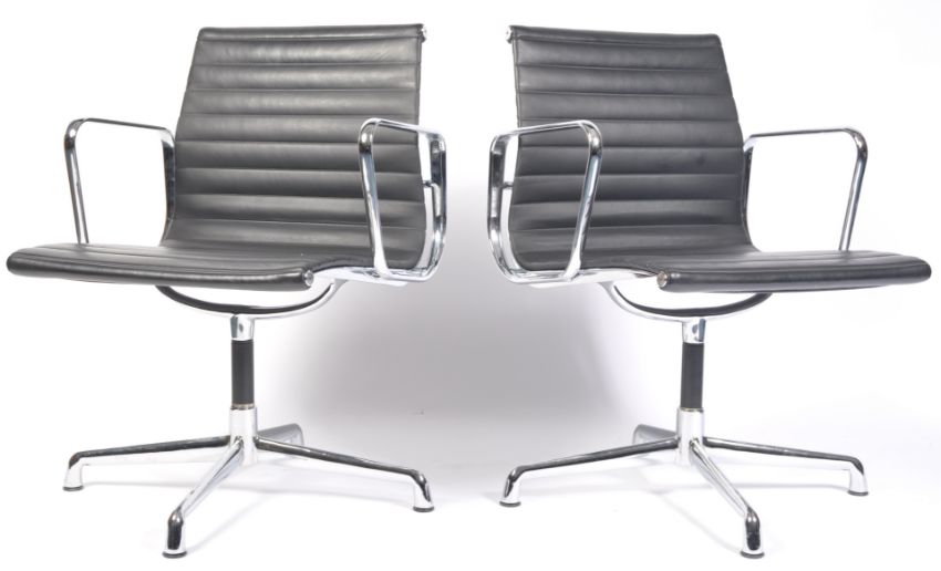 After Charles & Ray Eames - EA 107 - Aluminium group - A pair of contemporary Vitra type swivel desk chairs having a ribbed faux black semi aniline leather seat and backrest as one with aluminium arms, the chair raised on an aluminium stem and five point star base.