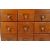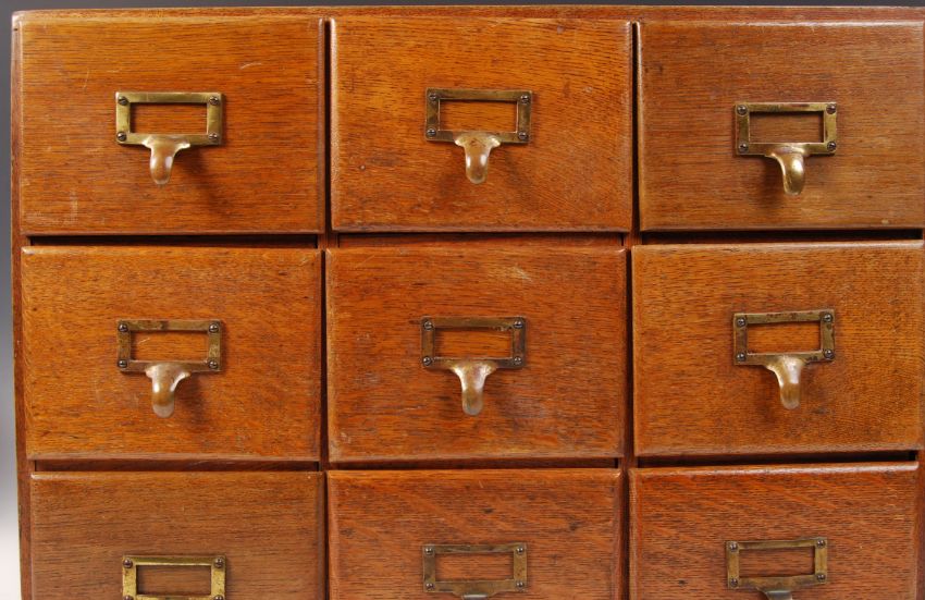 An antique vintage counter top oak cased nine drawer index filing cabinet having an arrangement of ' 3 x 3 ', each drawer having a brass index card holder and pull handle. Measures; 43cm x 58cm x 23cm.