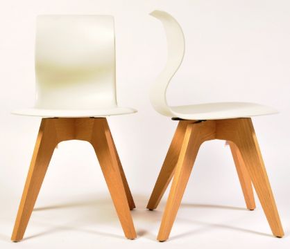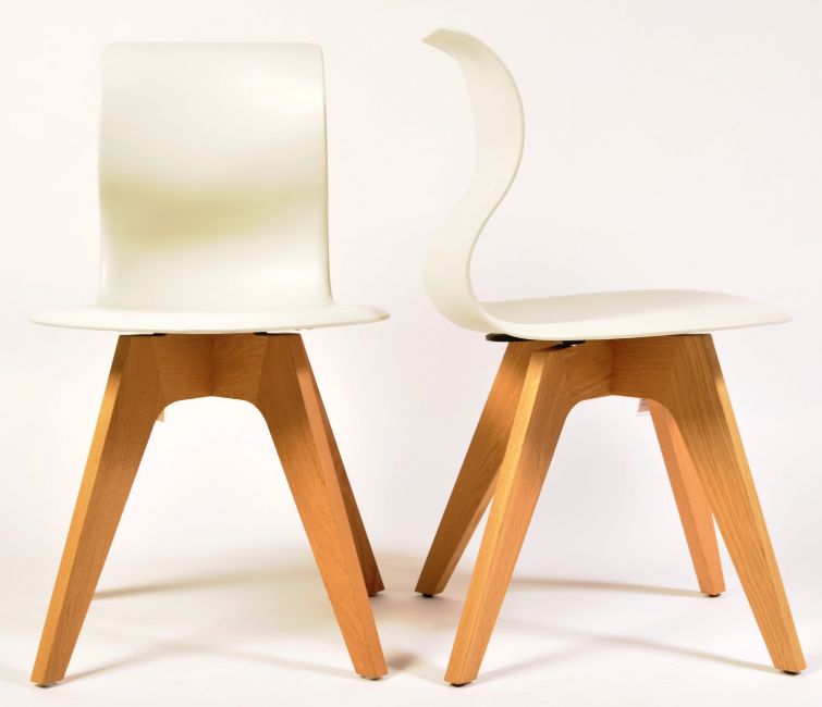 Aram - Pro-6 - a pair of contemporary Pro-6 shell dining chairs. Shaped seats and backs, mounted on splayed oak legs. Complete with Aram tag with makers details.