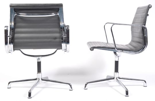 After Charles & Ray Eames - EA 107 - Aluminium group - A pair of contemporary Vitra type swivel desk chairs having a ribbed faux black semi aniline leather seat and backrest as one with aluminium arms, the chair raised on an aluminium stem and five point star base.