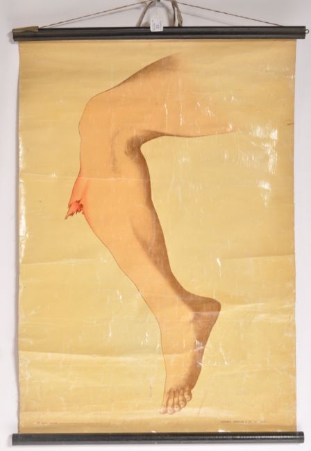 Ruddiman Johnston & Co Ltd, London - Two early 20th century linen backed anatomical medical scientific teaching aid chart depicting a broken legs, one showing the bone and leg and the other just the leg. Still retaining both wooden rods to top and bottom.